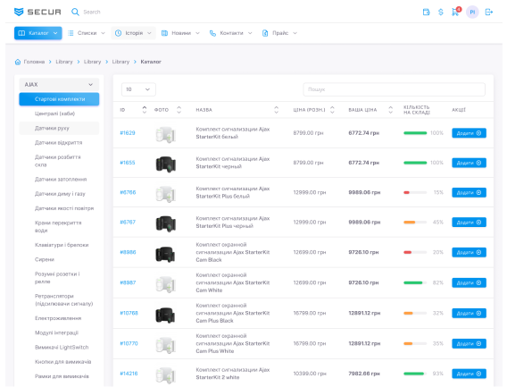 Дилерський портал Secur - це доступ до якісного безпекового обладнання та рішень. На сайті представлений розширений асортимент товарів - понад 16000 найменувань з вигідними умовами придбання. Після реєстрації та верифікації кожен дилер отримує доступ до особистого кабінету, де відображається вся історія покупок та оплат, збережені документ, рахунки тощо.